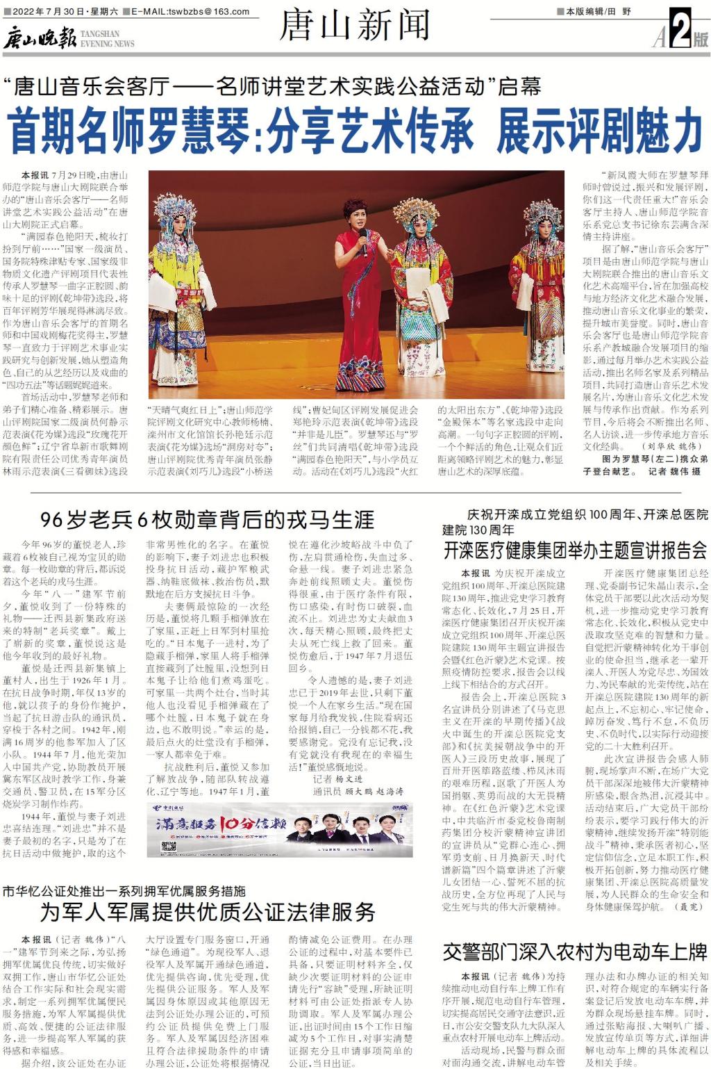 《唐山晚报》——唐山名师讲堂艺术实践公益活动启幕!首期名师罗慧琴:分享艺术传承 展示评剧魅力