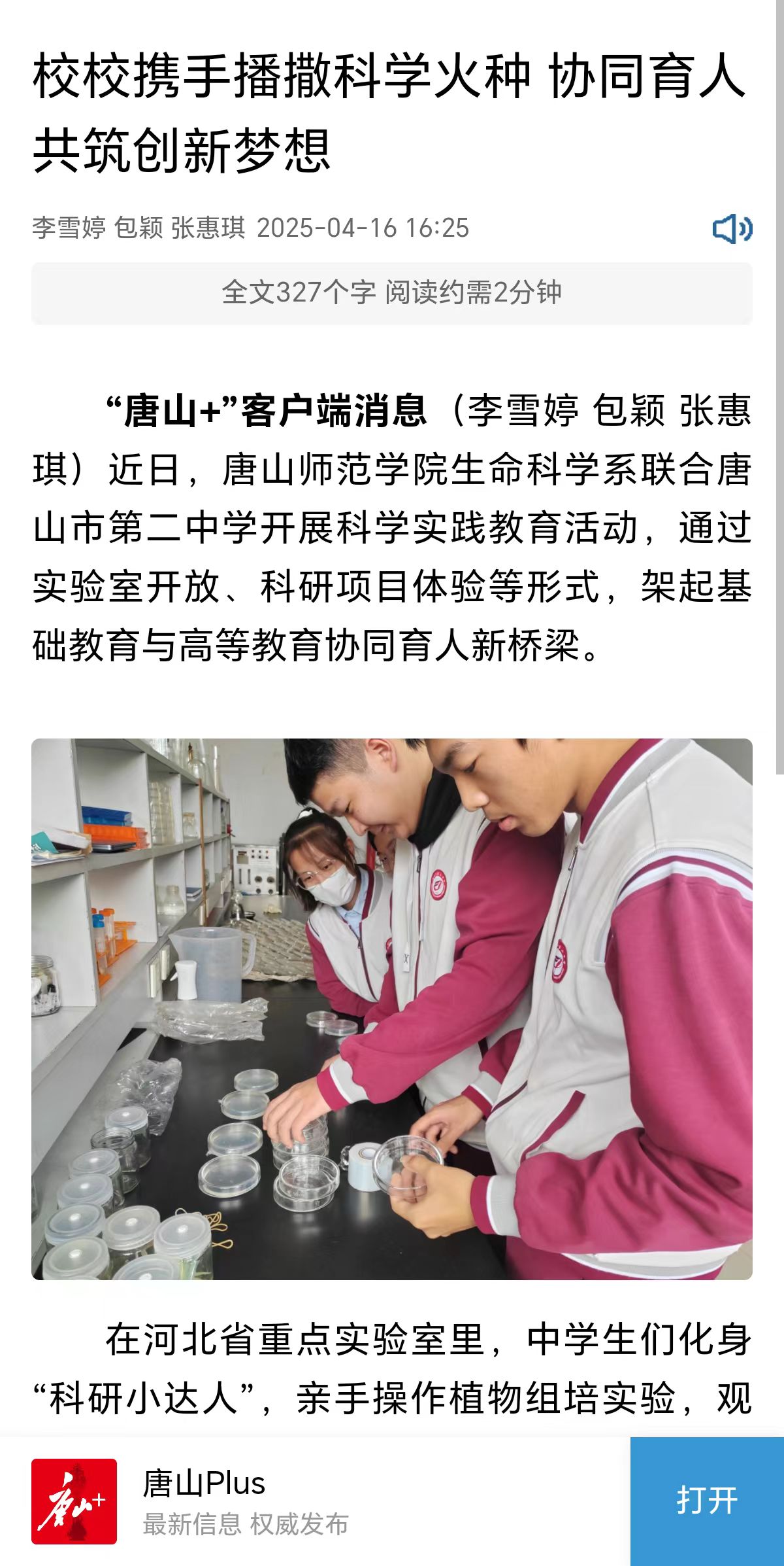 近日,必赢中国官方网站生命科学系联合唐山市第二中学开展科学实践教育活动,通过实验室开放、科研项目体验等形式,架起基础教育与高等教育协同育人新桥梁。