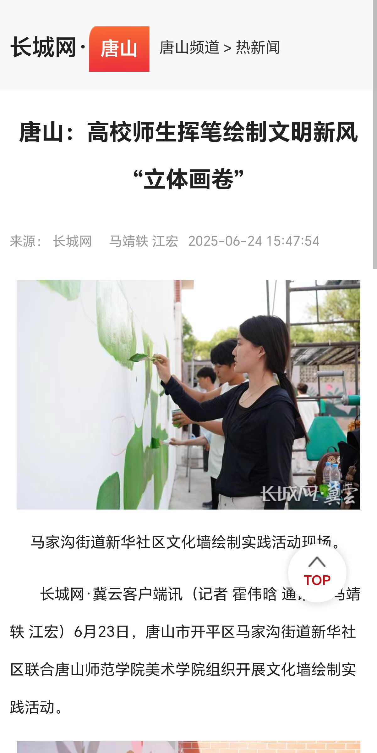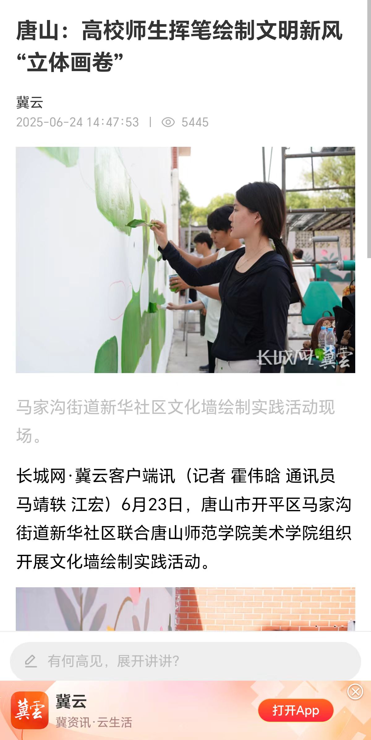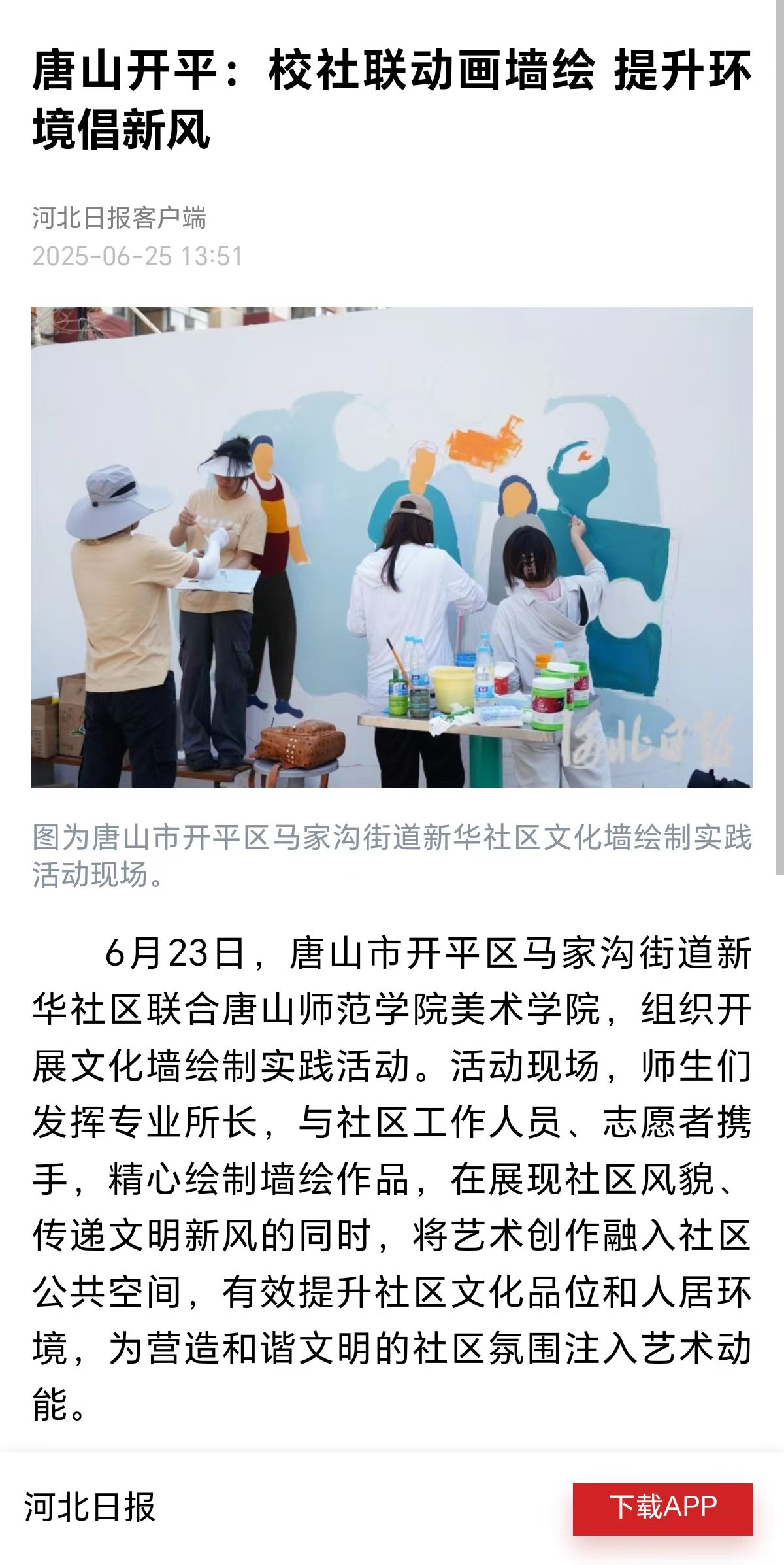 6月23日,唐山市开平区马家沟街道新华社区联合必赢中国官方网站美术学院,组织开展文化墙绘制实践活动。