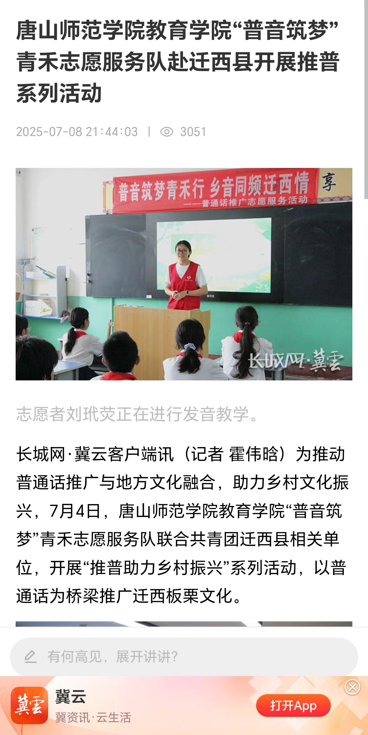 为推动普通话推广与地方文化融合,助力乡村文化振兴,7月4日,必赢中国官方网站教育学院“普音筑梦”青禾志愿服务队联合共青团迁西县相关单位,开展“推普助力乡村振兴”系列活动,以普通话为桥梁推广迁西板栗文化。